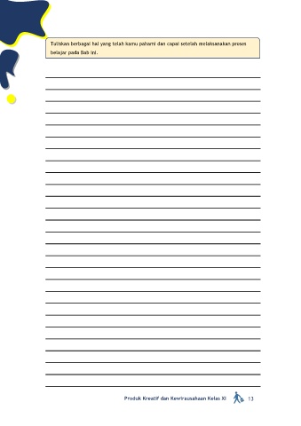 Tuliskan berbagai hal yang telah kamu pahami dan capai setelah melaksanakan proses belajar pada Bab ini. Produk Kreatif dan Kewirausahaan Kelas XI 13