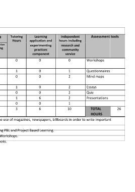 Class Hours/ Teaching Tutoring Learning Independent Assessment tools