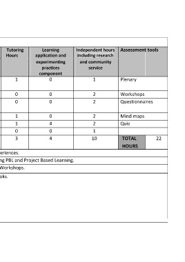 Class Hours/ Teaching Tutoring Learning Independent hours Assessment tools