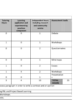Class Hours/ Teaching Tutoring Learning Independent hours Assessment tools