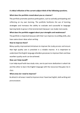 A critical reflection of the current subject think of the following questions.
