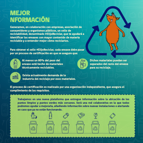 Generamos, en colaboración con empresas, asociación de consumidores y organismos públicos, un sello de reciclabilidad, denominado #ElijoReciclar, que te ayudará a identificar los envases con mayor contenido de materia reciclable y a entender mejor cómo reciclarlos.
