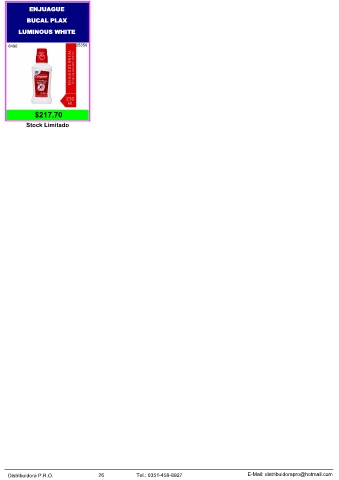 ENJUAGUE BUCAL PLAX LUMINOUS WHITE 8490 25356 2 $217.70 Stock Limitado Distribuidora P.R.O. 26 Tel.: 0351-458-8927 E-Mail: distribuidorapro@hotmail.com