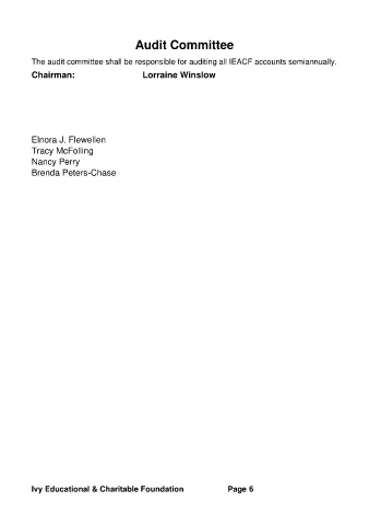 Audit Committee The audit committee shall be responsible for auditing all IEACF accounts semiannually. Chairman: Lorraine Winslow Elnora J. Flewellen Tracy McFolling Nancy Perry Brenda Peters-Chase Ivy Educational & Charitable Foundation Page 6
