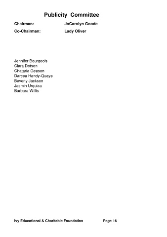 Publicity Committee Chairman: JoCarolyn Goode Co-Chairman: Lady Oliver Jennifer Bourgeois Clara Dotson Chataria Geason Darcea Handy-Quaye Beverly Jackson Jasmin Urquiza Barbara Willis Ivy Educational & Charitable Foundation Page 16
