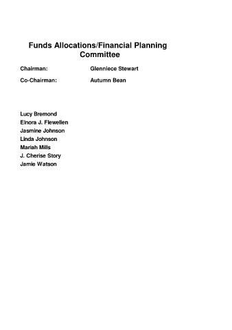 Funds Allocations/Financial Planning Committee Chairman: Glenniece Stewart Co-Chairman: Autumn Bean Lucy Bremond Elnora J. Flewellen Jasmine Johnson Linda Johnson Mariah Mills J. Cherise Story Jamie Watson