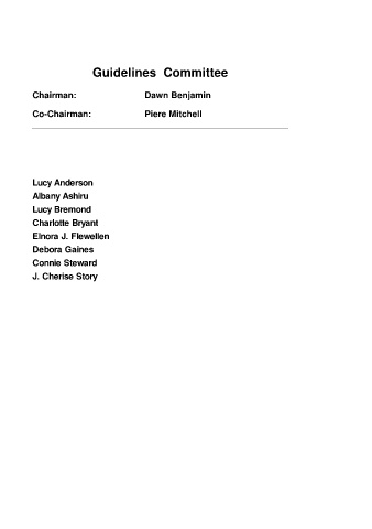 Guidelines Committee Chairman: Dawn Benjamin Co-Chairman: Piere Mitchell Lucy Anderson Albany Ashiru Lucy Bremond Charlotte Bryant Elnora J. Flewellen Debora Gaines Connie Steward J. Cherise Story