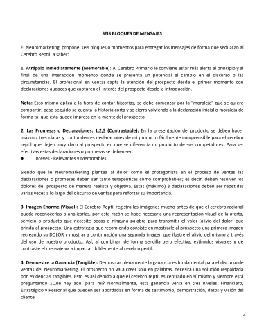 El Neuromarketing propone seis bloques o momentos para entregar los mensajes de forma que seduzcan al Cerebro Reptil, a saber: