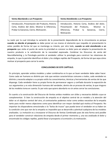 En cuanto a la construcción del Discurso de Ventas ambos modelos son útiles y necesarios debido a que se complementan. Si bien la construcción de empatía es el objetivo central de un modelo y la atención del dolor es el objetivo central del otro, al contrastarlos podemos notar como ambos necesitan de la empatía tanto para recibir menos objeciones como para identificar con mayor claridad qué motiva al Prospecto. No importan los disparadores emocionales o la “bolsa de trucos” que pueda tener el vendedor en su haber sin la condición sine qua non de la empatía es imposible que se desarrolle a plenitud cualquiera de los modelos analizados. La invitación es a incorporar el Discurso de Ventas Combinado pues de esta forma será posible para el vendedor construir relaciones de empatía desde el primer momento y, una vez analizado el dolor y encontrado los códigos reptiles, podrá llevar al prospecto a la emoción y la motivación.