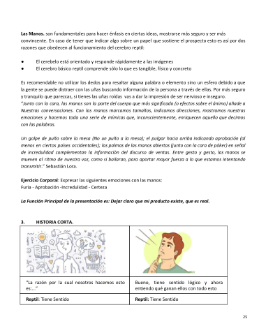 Las Manos. son fundamentales para hacer énfasis en ciertas ideas, mostrarse más seguro y ser más convincente. En caso de tener que indicar algo sobre un papel que sostiene el prospecto esto es así por dos razones que obedecen al funcionamiento del cerebro reptil: