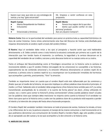 Historia Corta: Esta es la oportunidad del vendedor para poner en práctica toda su capacidad histriónica a la hora de contar historias. Como vimos anteriormente esta fase del Discurso de Ventas está diseñada para impactar directamente al cerebro reptil a través del cerebro límbico