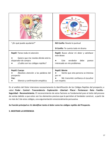 En el análisis del Dolor interviene necesariamente la identificación de los Códigos Reptiles del prospecto; a saber: Poder - Control - Trascendencia - Exploración - Libertad - Placer - Pertenecer - Reto - Familia - Seguridad - Reconocimiento. El reconocimiento de estos factores es fundamental para el éxito del proceso de ventas debido a que estos son los elementos precisos que le permiten al Vendedor construir, a partir de no más de 3 de estos códigos, una argumentación emocionalmente persuasiva.