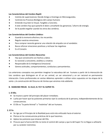 Los anteriores conceptos nos permiten imaginar la naturaleza del ser humano a partir de la interacción de tres cerebros que distinguen en él un ser animal, un ser emocional y un ser racional en permanente interacción. Como profesionales en ventas debemos aprender a utilizar estos supuestos en las etapas de la venta y la construcción del Discurso de Ventas que veremos más adelante.