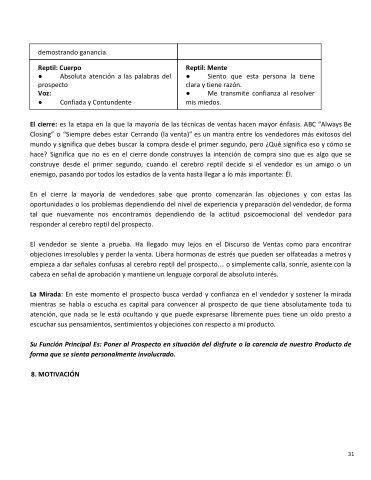 El cierre: es la etapa en la que la mayoría de las técnicas de ventas hacen mayor énfasis. ABC “Always Be Closing” o “Siempre debes estar Cerrando (la venta)” es un mantra entre los vendedores más exitosos del mundo y significa que debes buscar la compra desde el primer segundo, pero ¿Qué significa eso y cómo se hace? Significa que no es en el cierre donde construyes la intención de compra sino que es algo que se construye desde el primer segundo, cuando el cerebro reptil decide si el vendedor es un amigo o un enemigo, pasando por todos los estadios de la venta hasta llegar a lo más importante: Él.