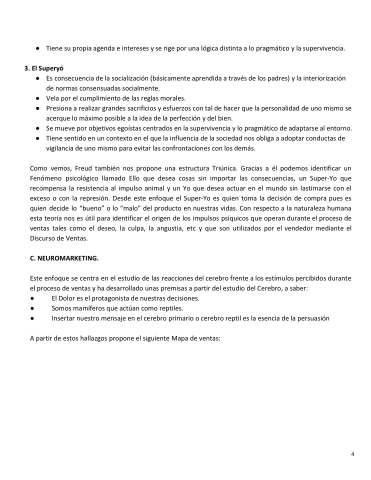 Como vemos, Freud también nos propone una estructura Triúnica. Gracias a él podemos identificar un Fenómeno psicológico llamado Ello que desea cosas sin importar las consecuencias, un Super-Yo que recompensa la resistencia al impulso animal y un Yo que desea actuar en el mundo sin lastimarse con el exceso o con la represión. Desde este enfoque el Super-Yo es quien toma la decisión de compra pues es quien decide lo “bueno” o lo “malo” del producto en nuestras vidas. Con respecto a la naturaleza humana esta teoría nos es útil para identificar el origen de los impulsos psíquicos que operan durante el proceso de ventas tales como el deseo, la culpa, la angustia, etc y que son utilizados por el vendedor mediante el Discurso de Ventas.