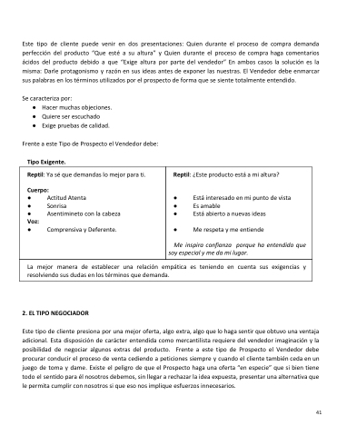 Este tipo de cliente puede venir en dos presentaciones: Quien durante el proceso de compra demanda perfección del producto “Que esté a su altura” y Quien durante el proceso de compra haga comentarios ácidos del producto debido a que “Exige altura por parte del vendedor” En ambos casos la solución es la misma: Darle protagonismo y razón en sus ideas antes de exponer las nuestras. El Vendedor debe enmarcar sus palabras en los términos utilizados por el prospecto de forma que se siente totalmente entendido.