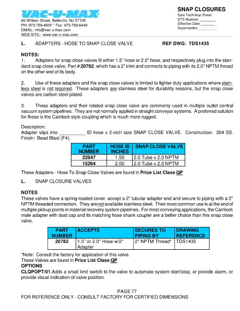 dard snap close valve, Part # 20782, which has a 2" inlet and connects to piping with its 2.0" NPTM thread