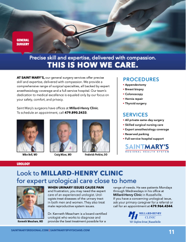 and frustration you may need the expert care of of an an experienced urologist Urol- ogists treat treat diseases of of the urinary tract in in both men men and women They also treat treat male reproductive system issues Dr Kenneth Meacham is is a a a a a a board-certified urologist who works to diagnose and provide the best treatment possible for a a a a range of of needs He see patients Mondays through Wednesdays in in in his office at at Millard-Henry Clinic in in in in Russellville If you you have a a a a a a a a a concerning urological issue ask your primary caregiver for for a a a a a a a a a a a a referral or or or call for for an appointment at 479 964 4344 101 Skyline Drive | Russellville SAINT SAINT REGIONAL | SAINTMARYSREGIONAL COM COM | SAINTMARYSPHYSICIANS COM COM 11