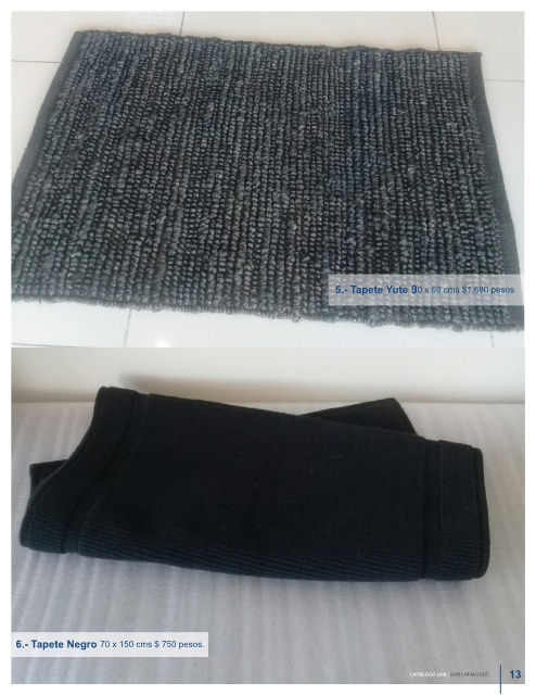 5.- Tapete Yute 9 0 x 60 cms $1,680 pesos. 6.- Tapete Negro 70 x 150 cms $ 750 pesos. CATÁLOGO 2018 / 2018 CATALOGUE 13