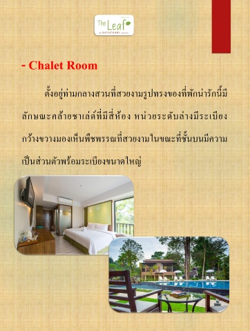 - Chalet Room ตั้งอยู่ท่ามกลางสวนที่สวยงามรูปทรงของที่พักน่ารักนี้มี ลักษณะคล้ายชาเล่ต์ที่มีสี่ห้อง หน่วยระดับล่างมีระเบียง กว้างขวางมองเห็นพืชพรรณที่สวยงามในขณะที่ชั้นบนมีความ เป็นส่วนตัวพร้อมระเบียงขนาดใหญ่