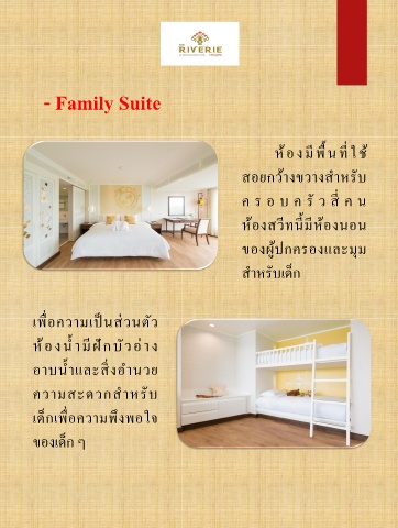 - Family Suite ห้องมีพื้นที่ใช้ สอยกว้างขวางส าหรับ ค ร อ บ ค รั ว สี่ ค น ห้องสวีทนี้มีห้องนอน ของผู้ปกครองและมุม ส าหรับเด็ก เพื่อความเป็นส่วนตัว ห้องน ามีฝักบัวอ่า ง ้ อาบน าและสิ่งอ านว ย ้ ความสะดวกส าหรับ เด็กเพื่อความพึงพอใ จ ของเด็ก ๆ