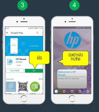 1 2 3 4 พิมพ์ชื่อแอป ติดตั้ง เปิด ปัดหน้าจอไป ยอมรับ ทางซ้าย