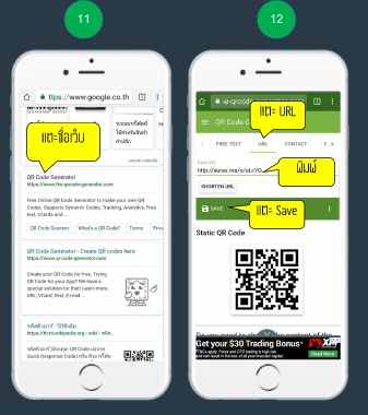 9 10 11 12 พิมพ์ qrcode แตะ Chrome แตะ URL แตะชื่อเว็บ พิมพ์ แตะ Save