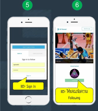 5 6 7 8 เปิดแอป HP Reveal แตะ Sign In น ามือถือไปส่องภาพ แตะ ให้แสดงข้อความ Trigger Following