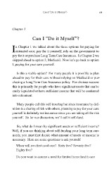 Can I “Do it Myself”? 19 Chapter 3 Can I “Do it Myself”? n Chapter 1 we talked about the three options for paying for Iextended care; pay for it yourself, rely on the government to pay for it or purchase Long Term Care Insurance. In Chapter 2 we skipped ahead to option 2, Medicaid. Now let’s go back to option 1, paying for your care yourself. Is this a viable option? For many people it is possible to plan ahead to pay for their care without relying on Medicaid or pur- chasing a Long Term Care Insurance policy. For obvious reasons this is primarily for people who have signifcant assets that can be easily liquidated or have suffcient income that will be continued into retirement. Many people call this self-insuring but since insurance by def- nition is a sharing of risk with others, planning to pay for your care yourself is defnitely not insurance since you are taking all the risk yourself. So for our discussion, we’ll call it self-fund. So, what do I mean by signifcant assets or suffcient income? Well, if you are thinking about self-funding your long term care needs, you must frst decide what amount of assets or income is necessary. Here are some questions to ask yourself. When will you frst need care? Sixty fve? Seventy fve? Eighty fve? Do you want to assume a need for limited home health care