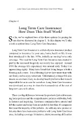 Long Term Care Insurance: How Does This Stuff Work? 23 Chapter 4 Long Term Care Insurance: How Does This Stuff Work? o far, we’ve explored two of the three options for paying for Scare that we discussed in chapter 1. In this chapter we’ll take a look at option three: Long Term Care Insurance. Long Term Care Insurance is a relatively new insurance product compared to insurance for your auto, home, health or life. It was frst introduced in the late 1970s, initially as nursing home only coverage. The need for Long Term Care Insurance was created in part by the increased longevity our society has enjoyed. Around 1930 the average life expectancy was around sixty. Today it is approaching eighty. Many have found that living longer is both a blessing and a curse. It is a blessing that we have more time with our family and to enjoy retirement. Unfortunately a longer life also means we are more likely to develop health problems that make it impossible for us to care for ourselves. Long Term Care Insurance was developed as a way to share the increased risk of the cost of long term care with others. There is a big difference between the products frst sold as nurs- ing home policies and the comprehensive policies sold today, both in features and in pricing. Insurance companies have entered and left the market and today there are probably less than 10 companies that issue the majority of the policies. As with any new product or industry there have been some problems with Long Term Care Insur- ance, including coverage limitations, claim processing diffculties
