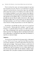 34 Growing Old Without a Plan for Long Term Care is not for Sissies Prior to the last few years, rate increases among the top insur- ance companies were rare. However, for several reasons including reduced investment income, lower policy lapse rate and higher policy usage than expected, most companies have had to raise rates on existing policyholders in recent years. Experts believe that poli- cies purchased today are probably priced appropriately and therefore rate increases are less likely. Still, it’s a good idea to plan for a possible rate increase when you make your purchase. Also, keep in mind that if in the event of a rate increase you are unable to afford the higher premium, you will likely be offered an opportunity to reduce benefts to keep your premium at or near the original cost. Something to consider that can affect your cost for Long Term Care Insurance: Most people don’t purchase Long Term Care Insurance in an amount suffcient to pay for the full cost of their care. They self-fund part of the expected cost and insure the rest. Your Long Term Care Planning Advisor will help you determine what combination of self-fund and Long Term Care Insurance is right for you and your budget. Summary The cost of your Long Term Care Insurance policy is determined by you. With the aid of your Long Term Care Planning Advisor you fnd the combination of benefts and premium that meets your needs and your budget. Many people choose a combination of Self-Fund and Long Term Care Insurance instead of purchasing enough Long Term Care Insurance to cover all the expected cost. Also, unless you want to make sure the insurance company makes more money off of you, plan on paying your premiums annually.