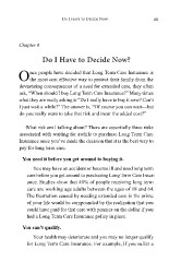 Do I Have to Decide Now? 35 Chapter 6 Do I Have to Decide Now? nce people have decided that Long Term Care Insurance is Othe most cost effective way to protect their family from the devastating consequences of a need for extended care, they often ask, “When should I buy Long Term Care Insurance?” Many times what they are really asking is “Do I really have to buy it now? Can’t I just wait a while?” The answer is, “Of course you can wait—but do you really want to take that risk and incur the added cost?” What risk am I talking about? There are essentially three risks associated with waiting for awhile to purchase Long Term Care Insurance once you’ve made the decision that it is the best way to pay for long term care. You need it before you get around to buying it. You may have an accident or become ill and need long term care before you get around to purchasing Long Term Care Insur- ance. Studies show that 40% of people receiving long term care are working age adults between the ages of 18 and 64. The frustration caused by needing extended care in the prime of your life would be compounded by the realization that you could have paid for that care with pennies on the dollar if you had a Long Term Care Insurance policy in place. You can’t qualify. Your health may deteriorate and you may no longer qualify for Long Term Care Insurance. For example, if you suffer a