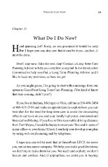 What Do I Do Now? 59 Chapter 11 What Do I Do Now? ead spinning yet? Sorry, no one promised it would be easy. HBut I hope you can also see that it can be done—in fact, it must be done. Don’t stop now. Take the next step! Contact a Long Term Care Planning Advisor to help you complete your plan! In the introduction I promised to help you fnd a Long Term Planning Advisor and I like to keep my promises, so here we go! As you might guess, I’m going to start with a message from our sponsor, GracePoint Long Term Care Planning. (You kind of knew that was coming, didn’t you?) If you live in Indiana, Michigan or Ohio, call me at 260-498-2454 or 800-655-2910 and make an appointment to explore how you can best plan for the need for long term care to avoid the devastating effect it can have on you and your family’s physical, emotional and fnancial well-being. If you live within reasonable driving distance from Fort Wayne, I would be happy to meet you “live and in person” in my offce or your home! If not, I can help you develop your plan by using web conferencing and by telephone. I hope you can tell by now that at GracePoint LTCP, we serve you, not an insurance company. We help you make good decisions; we don’t try to make them for you. We teach and explain; we don’t lecture and confuse. And, if appropriate, we assist you in buying;