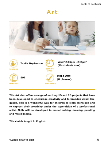 This Art club o o o ers a a a a a range of exciting 2D and 3D projects that have been developed to to encourage creativity and to to broaden visual lan- guage This is is a a a a a wonderful way for children to learn technique and to express their creativity under the the supervision of of a a a professional artist Skills will be developed in in in in in model making drawing painting and mixed media This club is is is taught in English *Lunch prior to club 31
