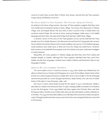 both versions concluded that Tiana people came from Galela, and sarau could mean headgear