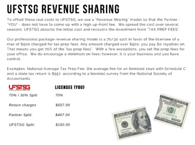 seasons. UFSTSG absorbs the initial cost and recovers the investment from "TAX PREP FEES".