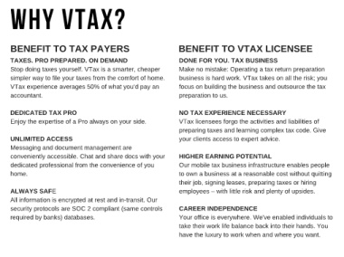 simpler way to file your taxes from the comfort of home. business is hard work. VTax takes on all the risk; you