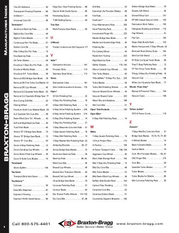 30GritPolishingPad . . . . . . . . . . . 22 3-StepDryPolishingPads . . . . . .18 3-StepWetPolishingPads . . . . . .12 5-Step Inline Polishing System . 220 6-Step Inline Polishing System . 219 6-Step Elite Polishing System . . . 14 7-StepDryPolishingPads . . . . . .21 7-Step Maxcrete Concrete Pads . 31 7-Step Quartz Polishing Pads . . . . 18 7-StepWetPolishingPads . . . . . .13 7-Step Marble Wet Polishing Pads 23 AntiquingBrushes . . . . . . . . . 26,27 ArrrayBridgeSawBlades . . . . . . .72 AluminumBack-UpPads . . . . . . . 29 Back-UpPads . . . . . . . . . . . . . 28,29, BlindCoreBits . . . . . . . . . . . . . . . . 36 BrazedCupWheels . . . . . . . . . . . . 40 Brazed Zero Tolerance Wheels . . 43 BrazedFlatCupWheel . . . . . . . . . 40 ChopBridgeSawBlade . . . . . . . . 76 ConcretePolishingPads . . . . . . . . 31 ContourBlade . . . . . . . . . . . . . . . . 64 Dia . Router Profile Wheels . 131-133 DryCoreBits . . . . . . . . . . . . . . 47,48