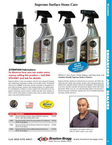 Supreme Surface cleaners for natural stone are non-toxic and 100% nat- urally derived. Unlike other granite cleaners and cleaning products for natural stone, Supreme Surface cleaners are designed to clean and polish your stone, and then ionically seal and protect against stains with ioSeal protectants. With every use, you will noticeably improve the feel and re- flection of granite countertops, enhance the colors of tumbled and honed travertine, marble and more.
