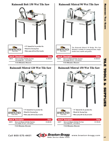 Raimondi Mistral 90 Wet Tile Saw $1,550.00 Cut Length 35-1/2”, 110 V 60 Hz