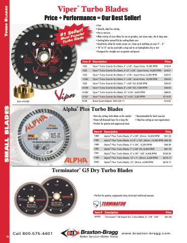 Viper® Turbo Granite Dry Blade, 4˝ x 5/8˝, Quad Holes, 15,000 RPM Viper® Turbo Granite Dry Blade, 4-1/2˝ x 5/8˝, Quad Holes, 13,300 RPM Viper® Turbo Granite Dry Blade, 5˝ x 5/8˝, Quad Holes,12,000 RPM Viper ® Turbo Granite Dry Blade, 6˝ x 5/8˝, Quad Holes, 10,000 RPM Viper ® Turbo Granite Dry Blade, 7˝ x 5/8˝ KO, 8,500 RPM