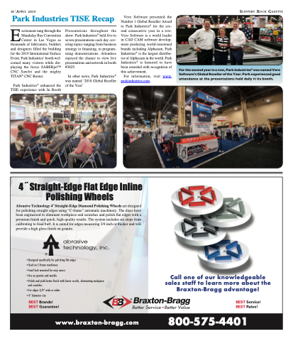 Excitement rang through the Mandalay Bay Convention Center in Las Vegas as thousands of fabricators, builders and designers filled the building for the 2019 International Surface Event. Park Industries’ booth wel- comed many visitors while dis- playing the fierce SABERjetTM CNC SawJet and the mighty TITAN® CNC Router.