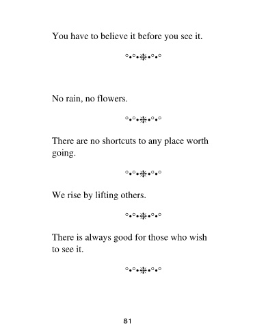You have to believe it before you see it. °•°•❈•°•° No rain, no flowers. °•°•❈•°•° There are no shortcuts to any place worth going. °•°•❈•°•° We rise by lifting others. °•°•❈•°•° There is always good for those who wish to see it. °•°•❈•°•° 81