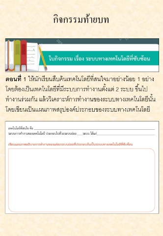 กิจกรรมท้ายบท ตอนที่ 1 ให้นักเรียนสืบค้นเทคโนโลยีที่สนใจมาอย่างน้อย 1 อย่าง โดยต้องเป็นเทคโนโลยีที่มีระบบการทํางานตั้งแต่ 2 ระบบ ขึ้นไป ทํางานร่วมกัน แล้ววิเคราะห์การทํางานของระบบทางเทคโนโลยีนั้น โดยเขียนเป็นแผนภาพสรุปองค์ประกอบของระบบทางเทคโนโลยี