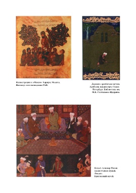 Иллюстрация к «Макам» Харири. Москва. Институт востоковедения РАН. Дервиш с разбитым мячом. Арабская миниатюра. Санкт- Петербург. Библиотека им. М.Е. Салтыкова-Щедрина. Бехзад. Алишер Навои среди ученых мужей. Лондон. Британский музей.