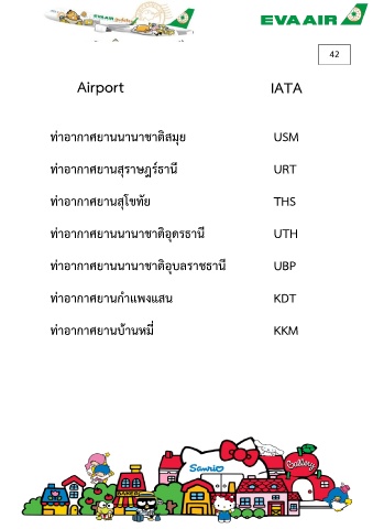 42 Airport IATA ท่าอากาศยานนานาชาติสมุย USM ท่าอากาศยานสุราษฎร์ธานี URT ท่าอากาศยานสุโขทัย THS ท่าอากาศยานนานาชาติอุดรธานี UTH ท่าอากาศยานนานาชาติอุบลราชธานี UBP ท่าอากาศยานก าแพงแสน KDT ท่าอากาศยานบ้านหมี่ KKM