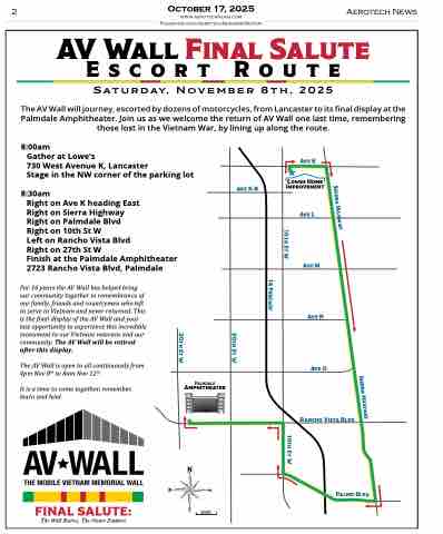 Palmdale Amphitheater. Join us as we welcome the return of AV Wall one last time, remembering those lost in the Vietnam War, by lining up along the route.