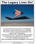 To mark the 35th anniversary of the F-117A Nighthawk, there will be a reunion June 23-23, 2017, in Las Vegas. The reunion is open to anyone who participated in any aspect of the F-117A program.