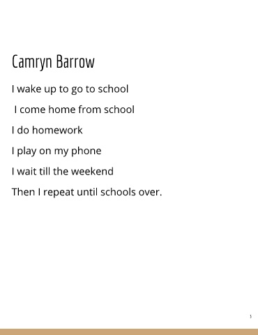 Camryn Barrow I wake up to go to school I come home from school I do homework I play on my phone I wait till the weekend Then I repeat until schools over. 3
