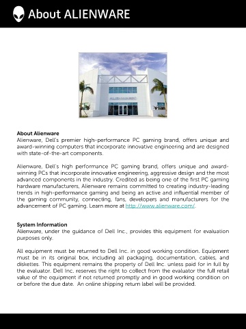 Alienware, under the guidance of Dell Inc., provides this equipment for evaluation